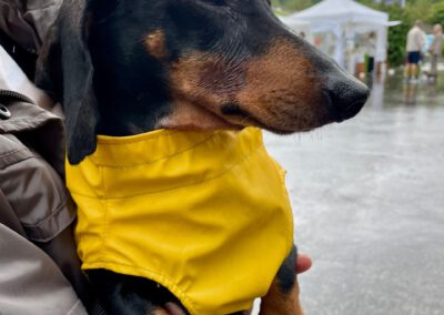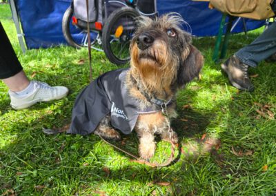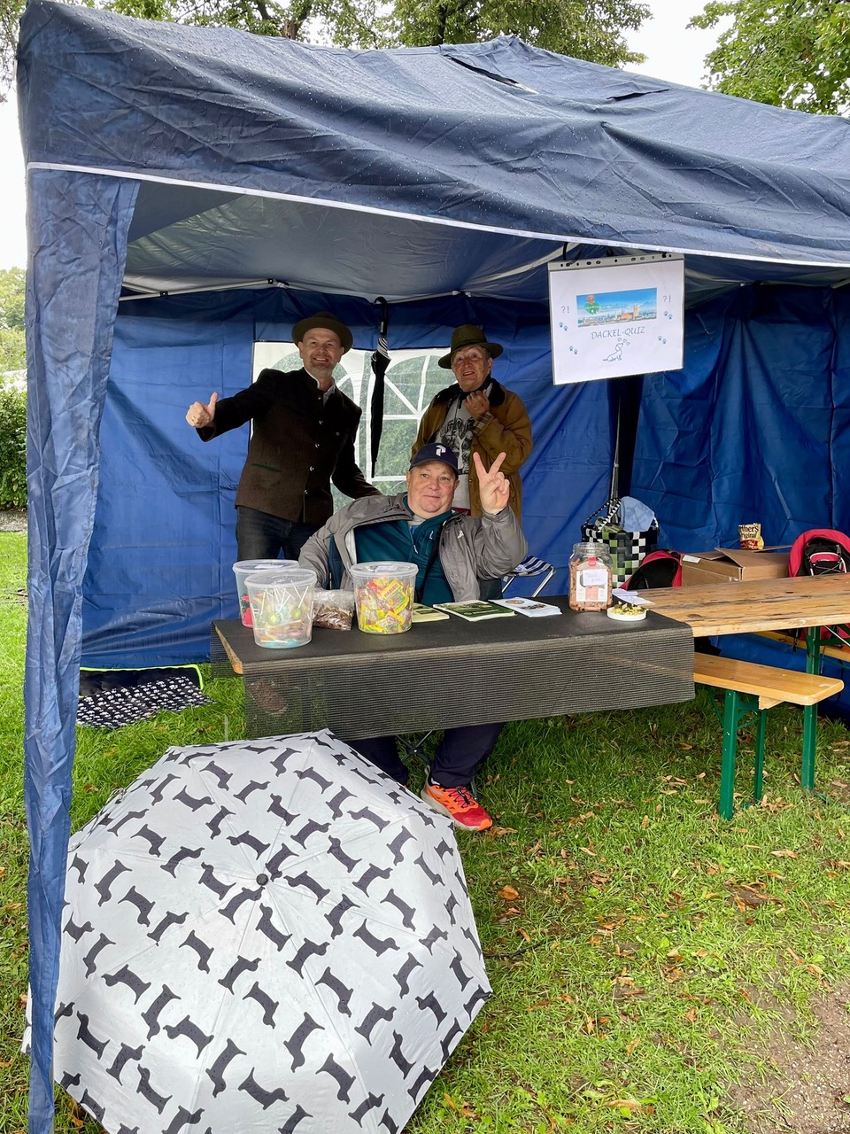 Am 03. August 2025 waren wir als Sektion München des Bayerischen Dachshundklubs zum ersten Mal mit einem Infostand auf dem Dackel Day vertreten. Unsere Dackel und unsere Mitglieder haben definitiv bewiesen, dass sie wetterfest sind! Bei sehr wechselhaftem Wetter mit heftigen Regenschauern haben wir ein Dackel-Quiz für interessierter Besucher angeboten, bei dem man sein (un)nützes Wissen über unsere besten Freunde prüfen konnte. In drei Schwierigkeitsgraden musste jeweils eine zufällige Frage beantwortet werden. Die Fragen reichten von Basiswissen (welche Haararten gibt es beim Dackel?) bis zu Insiderwissen (welche bekannten Prominenten hatten oder haben Dackel?). Kleine Mitbringsel, Süßes und Hundekekse gab es als Lohn für richtige Antworten.